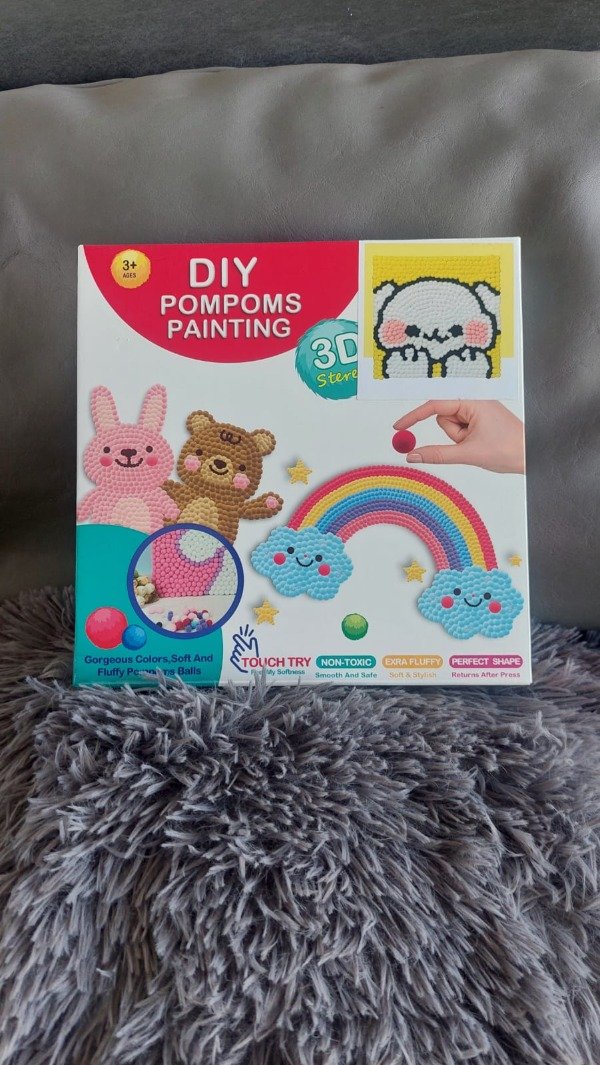 KIT PINTURA CON POMPONES: Creatividad Táctil y Motricidad Fina. Un juego creativo ideal para niños de +4 años, que ofrece una actividad libre de pantallas y altamente estimulante. Mecánica: Usar la herramienta especial para colocar los pompones de colores sobre el bastidor adhesivo. Beneficios Clave: ✅ Estimula la creatividad y la imaginación. ✅ Mejora la coordinación motriz y las habilidades manuales. Contenido: Bastidor adhesivo, pompones de colores y herramienta de colocación. Diseño Disponible: Conejito blanco con fondo amarillo. Medidas del Cuadro: 20 x 20 cm.