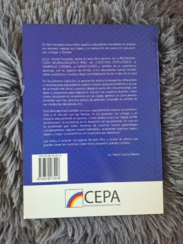 La Lic. Silvina Fernandes, reúne en este libro aportes de la Programación Neurolinguística (PNL), del Coaching Ontológico, la gimnasia cerebral, el mindfulness y también de su experiencia personal; con el objetivo de brindar a los educadores nuevas miradas sobre la práctica y muchas ideas concretas para llevar a cabo en el aula.