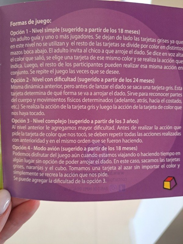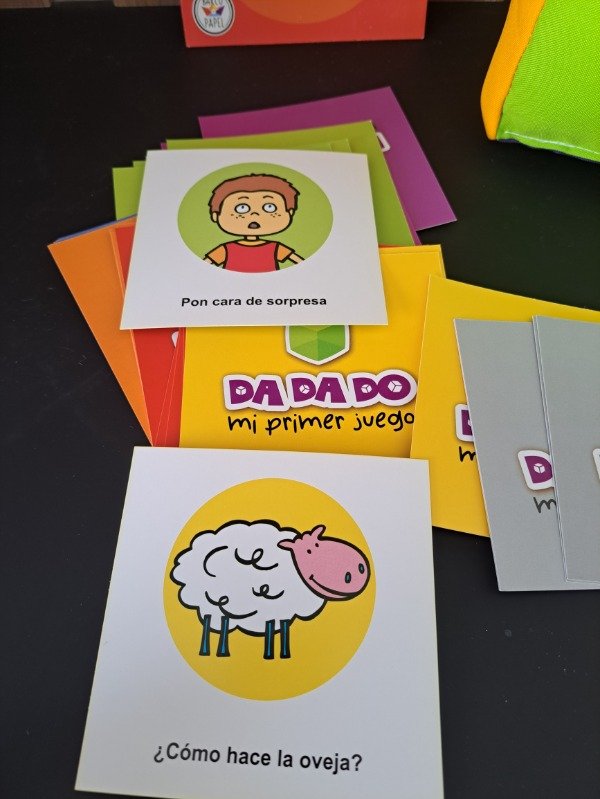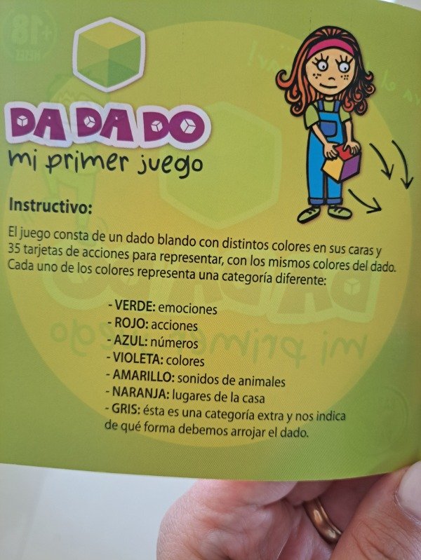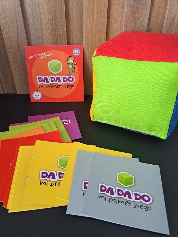 DADADO: El Primer Juego Educativo para Bebés (+18 Meses). Un juego de aprendizaje versátil y seguro, diseñado con un dado gigante, suave y blandito (16 cm) y mazos de cartas temáticas (35 cartas). 6 Categorías de Aprendizaje Temprano: Partes del cuerpo, Emociones, Colores, Números, Lugares de la casa, Sonidos de animales, entre otros. Desarrollo Integral: Fomenta habilidades esenciales como motoras, lenguaje, comunicación, coordinación, memoria y atención. Versátil: 4 formas de jugar diferentes con reglas simples y flexibles. Contenido: 1 Dado (16 cm), 1 Mazo de 35 cartas (10x10 cm), Instructivo. Edad: +18 meses. ¡Diversión y desarrollo garantizados para toda la familia!